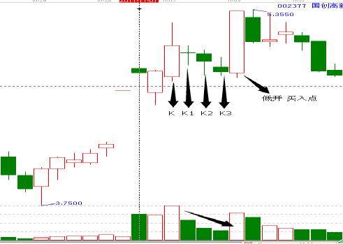 在股票形態(tài)中直升機空中加油戰(zhàn)法和陽包陰想綜合話就形成了三只喜鵲鬧枝頭短線戰(zhàn)法。該股的具體圖形如下圖。當這種形態(tài)出現(xiàn)在一波上漲的初始階段或者中途階段,是對之前上漲趨勢的延伸。這種出現(xiàn)后,第二天通常低開的機會就是買點,記住,第二天低開的點位基本上會在K3的最低點處。所以買點很好把握,關(guān)鍵是看你有膽量如何。因為第二天的低開就是第四個陰線了。