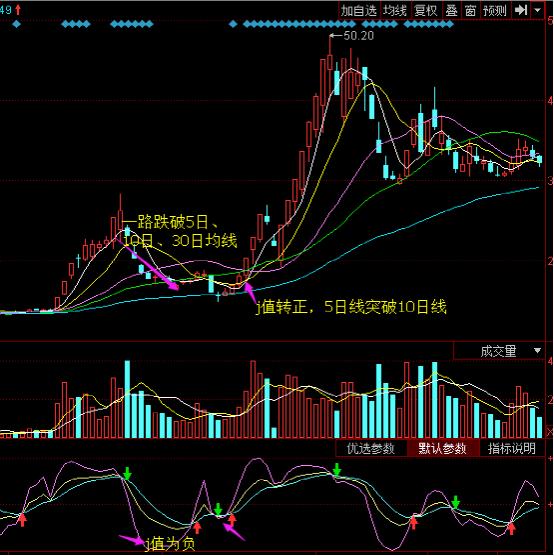 在kdj中,j值反應(yīng)最快,在做判斷的時(shí)候,更要關(guān)注j值的變化。當(dāng)股價(jià)連連跌破5日線、10日線以致20日線的時(shí)候。在第一次跌破20日線的時(shí)候一般為階段性底部,此時(shí)一旦j值在零軸以下,出現(xiàn)負(fù)值,此時(shí)我們應(yīng)該尤為關(guān)注。當(dāng)股價(jià)再次向上突破5日線的時(shí)候,股價(jià)必然會(huì)創(chuàng)出新高。而我們?cè)谶@反彈到前高附近的利潤(rùn)就可以拿到手。這個(gè)方法對(duì)于連續(xù)下跌的股票概率會(huì)更大。下面我們看這個(gè)股票。