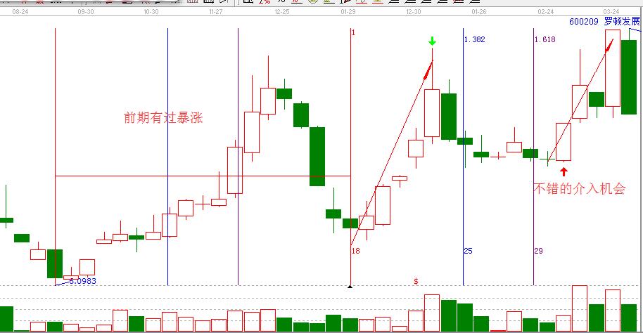 每個階段都有一些活躍的個股,這表明這些股票的主力是活的,他們對于市場的反應比那些已經不看盤的主力快速而猛烈。同時在前一階段爆發(fā)過比較大題材的個股值得重點關注。在技術上,結合時間周期,可以做他的第二波,如下面羅頓發(fā)展走勢圖。