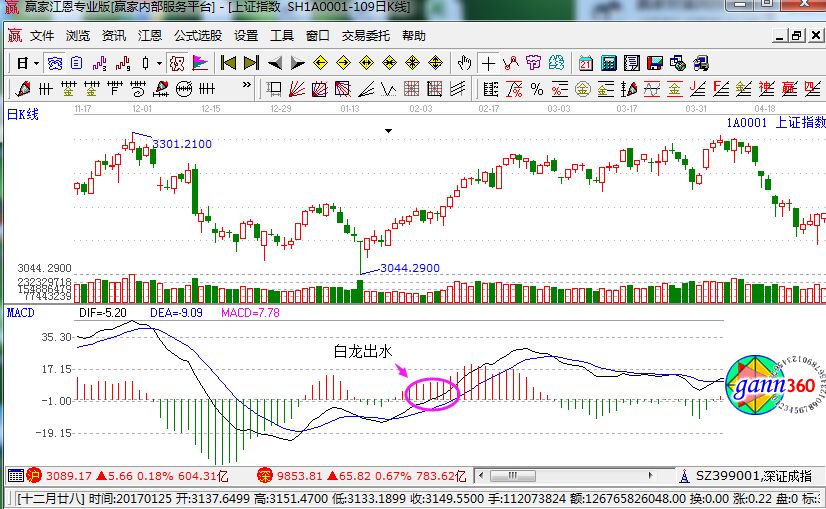 白龍出水是什么意思?所謂的白龍其實指的就是macd指標(biāo)中的DIF線,0軸為海平面,由于股價長期低迷致使DIF猶如一條沉睡的巨龍潛伏于海底,當(dāng)某日受到外力作用緩緩上移至水面時突然一躍而起,似一條白龍直沖云宵,勢頭強(qiáng)勁股價被迅速推高,因此稱之為“白龍出水”。此形態(tài)是非常難得的短線買入時機(jī)。如下面運用炒股軟件中所截取的上證走勢走勢圖。