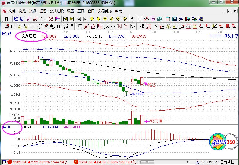 當(dāng)我們調(diào)到K線的時(shí)候,一般會(huì)在K線的下方對應(yīng)成交量的量柱,在成交量的下方像macd、kdj指標(biāo)等的出現(xiàn),當(dāng)然這是要根據(jù)投資者自己的使用愛好進(jìn)行調(diào)整的,在K線的上,大家也可以調(diào)出boll指標(biāo)、極反通道、均線等指標(biāo)的應(yīng)用。下面就是贏家江恩軟件中海航創(chuàng)新的走勢圖。