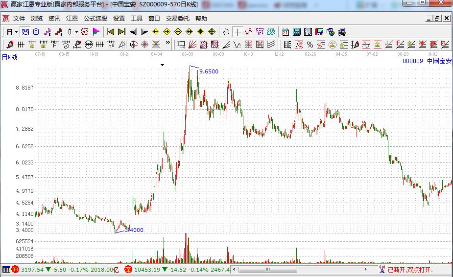 主力坐莊的完整過程通常是“吸、拉、派、落”,但受傷莊股的運(yùn)動軌跡只有“吸、拉、落”,而少了一個“派”,就是說主力經(jīng)過了吸籌和拉抬,沒來得及派發(fā)股價(jià)就回落了,這種情形令主力相當(dāng)難過——這就是受傷莊股。接下來我們就來看一只受傷莊股。