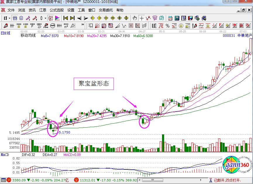 上圖是中糧地產的部分歷史走勢圖,從圖中我們看到,60日均線(綠色)的趨勢是向上的,而且K線已經成交量都非常的滿足上面的技術特征,所以是典型的聚寶盆形態(tài)。