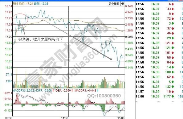 從當(dāng)天的分時走勢中,我們可以看到該股在開盤出現(xiàn)了快速拉升,并且形成了分時圖中的尖角波形態(tài),之后拐頭向下,分時線和均價線開始向下運行,說明了股價下跌的趨勢已經(jīng)形成了,所以是典型的跳空陰拉拐戰(zhàn)法的應(yīng)用,投資者應(yīng)該堅決的賣出,保存現(xiàn)有的利潤。
