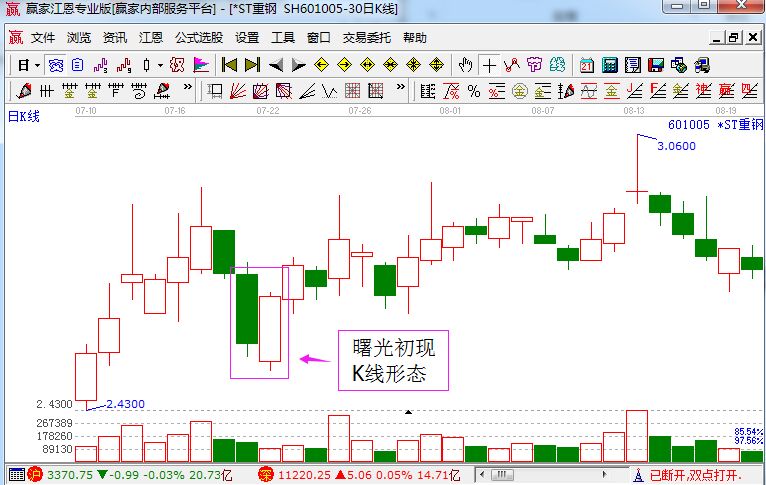 曙光初現(xiàn)K線形態(tài)出現(xiàn)時,對于激進的投資者來說,可以在第二天大陽線確立的當天尾盤介入,對于穩(wěn)健型的投資者,可以在形態(tài)成立的次日再擇機介入。