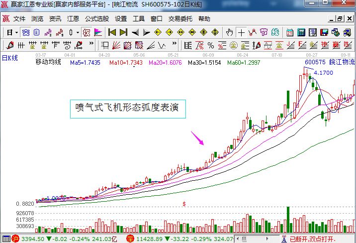 上圖就是皖江物流的歷史走勢(shì)圖,圖中的該股是一直是處于緩慢爬行的階段,漲幅雖然不大,但是該股的五條均線呈現(xiàn)處了多頭排列的走勢(shì),顯然是符合上面所講的噴氣式飛機(jī)形態(tài)的弧度表演。