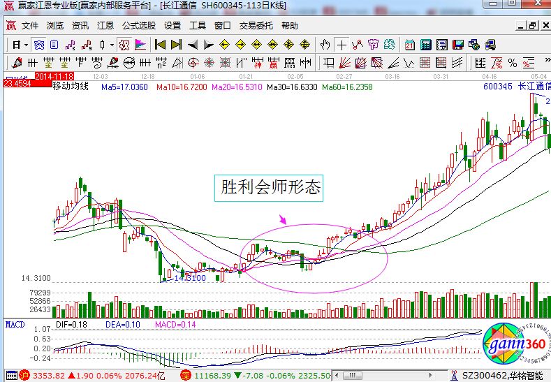 在長江通信的走勢中就形成了典型的勝利會師形態(tài),該形態(tài)說明了市場上由空方強勢逐漸的變成多空雙方僵持,最終一旦多頭排列完成,那就說明了市場進入多方強勢行情,未來價格將持續(xù)的上漲。