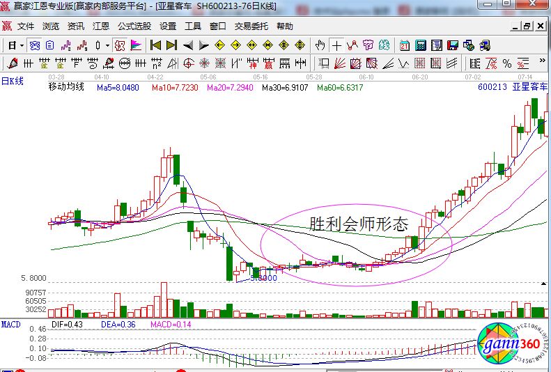 上圖中亞星客車在經(jīng)過了一段時間的下跌行情后,它的均線指標在底部形成了勝利會師形態(tài),這個形態(tài)就說明了市場上由空方強勢變成了多、空雙方任持的局面,在6月20日的時候,多頭排列最終完成,顯然此時的買點已經(jīng)出現(xiàn)。