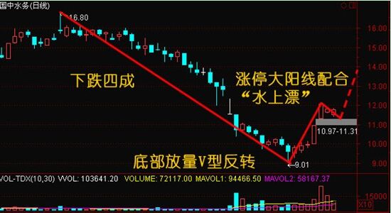 國中水務(wù)的走勢中,股價處于底部啟動的形態(tài),首先該股是超跌,該股在下跌的幅度大約是在四成左右,然后下跌到末段出現(xiàn)了量價背離,底部放量,打到9元之后開始V型反轉(zhuǎn),這個在個股當中是最強的反轉(zhuǎn)形態(tài)。伴隨著前期兩根漲停的是量能的逐步放大。2011年10月31號的跳空缺口形成了水上漂形態(tài)。
