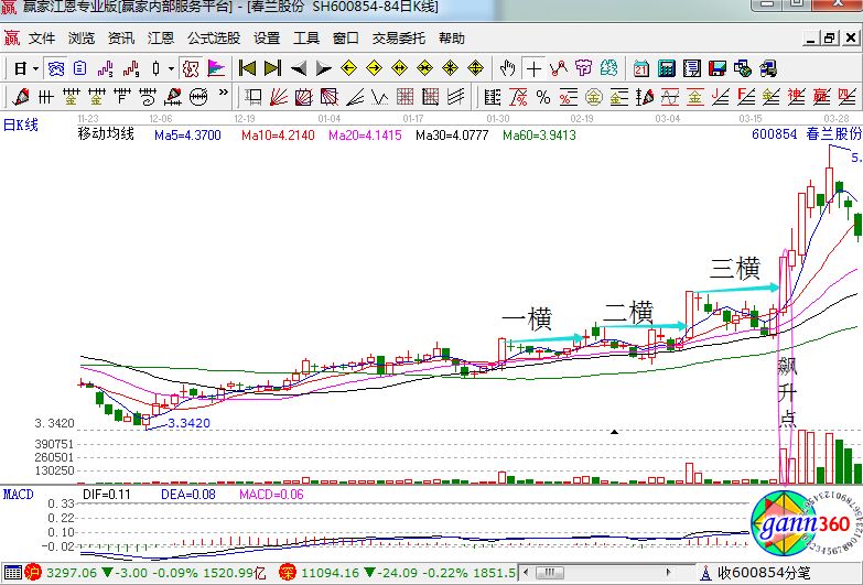 春蘭股份在2012年12月份的走勢中,我們可以看到,該股在27日站上了60日中期均線,它是屬于可以操作的范圍。該股在2013年1月30日出現(xiàn)了大陽線,在隨后小K線縮量盤整,盤后繼續(xù)出現(xiàn)了二橫三橫,在三橫經(jīng)歷了8根K線后爆發(fā),走出了幾十點(diǎn)的行情,這里需要注意的是: