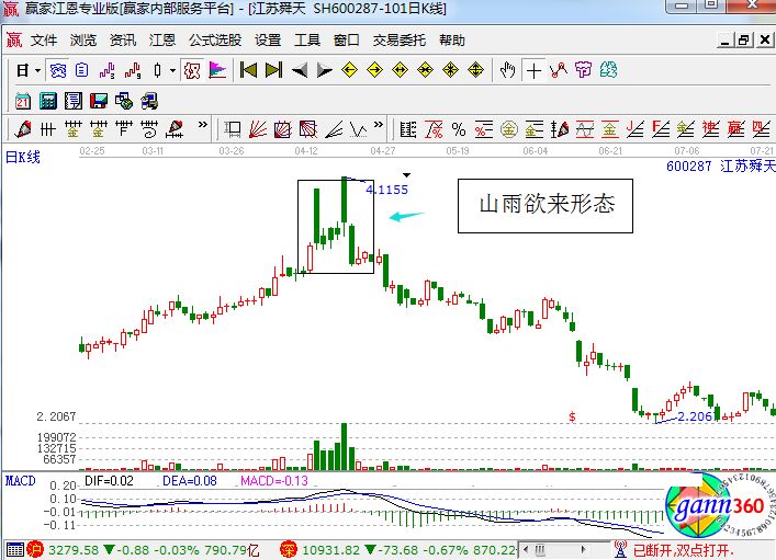 上圖是江蘇舜天的走勢圖,圖中該股形成的非常典型的山雨欲來走勢形態(tài),我們看到在該形態(tài)之后股價(jià)形成了幾根的陰線,之后開始跌皮前面K線的位置,形成了下跌的趨勢,顯然該形態(tài)是一個(gè)非常典型的賣出信號。