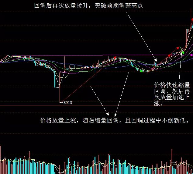 1、 價格放量上漲,然后回調(diào)時不能創(chuàng)新低,再次上行的時候量能重新放大。