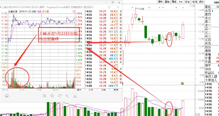 我們以上峰水泥的走勢(shì)圖來(lái)進(jìn)行介紹,該股在縮量整理過(guò)程中,1月22日雖然是縮量狀態(tài),再度當(dāng)天分時(shí)結(jié)構(gòu)中出現(xiàn)了非常標(biāo)準(zhǔn)的攻擊型量峰,這其實(shí)就是為后面的大陽(yáng)線埋下伏筆。