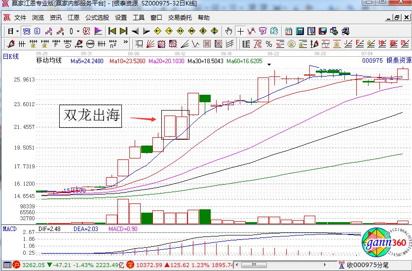 上圖是銀泰資源在2001年6月初的走勢圖,圖中該股已經(jīng)正式步入了主升段中,漲幅是驚人的,當(dāng)時是該股還是電力股的領(lǐng)頭羊,在6月11日的時候,該股的股價已經(jīng)遠離了5天均線,這個時候,莊家為了進一步控股該股的上升基礎(chǔ)和達到震倉的目的就采取了震倉手法,在6月12日的時候,該莊家突然令該股巨量大幅低開,迅速嚇出跟風(fēng)盤,然后又迅速上拉,和前一天的陽線共同組成了雙龍出海現(xiàn)象。