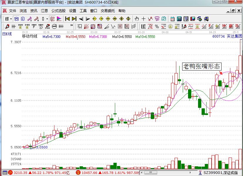 對于老鴨頭形態(tài)相信大家已經(jīng)了解了,其中還有一個形態(tài)就是老鴨張嘴形態(tài),它的技術(shù)特征是:5日線和10日線形成金叉反散之后,5日線在靠近10日均線但是還沒有到10日均線的時候就會重新拐頭向上方運行,形成的圖形就是老鴨張嘴形態(tài)。接下來我們就來看實達集團的案例圖形。