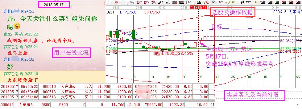 在5月17日依據(jù)贏家江恩的市價法則選擇,時間點突破江恩180度壓力線,形成買點。用戶按照規(guī)則同步操作,持股3個交易日,短線獲利已達10%。短期目標上方藍線,不能放量突破短線兌現(xiàn)換股,如下圖所示。