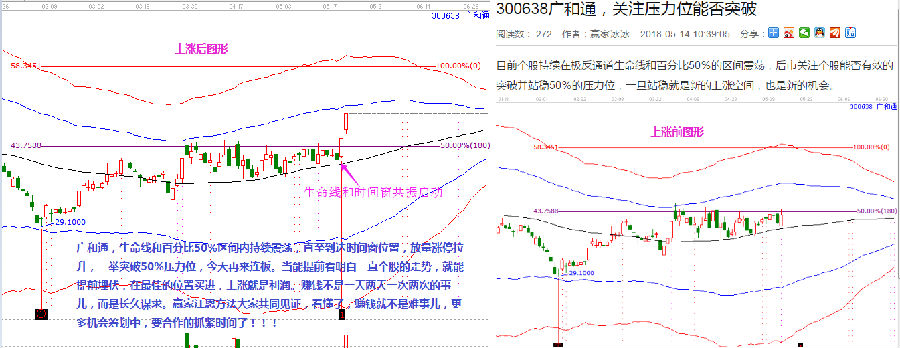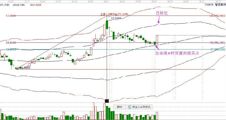 生命線和百分比50%區(qū)間內(nèi)持續(xù)震蕩,直至到達時間窗位置,放量漲停拉升,依據(jù)突破50%壓力位,連續(xù)兩個漲停板。當能提前看明白一只股票的走勢,就能提前埋伏,在最佳的位置買進,上漲就是利潤。如下圖所示。