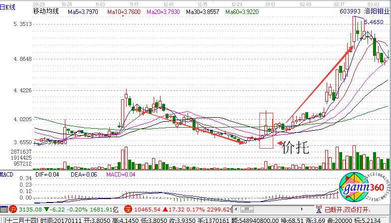 運(yùn)用價托進(jìn)行抄底的技術(shù)要點,主要有三點,即①5線上穿10線,5線上穿20線,10線上穿20線,形成三角形;②三角形托著陽線,伴隨著成交量放量;③價托形成后,均線呈現(xiàn)多頭排列。
