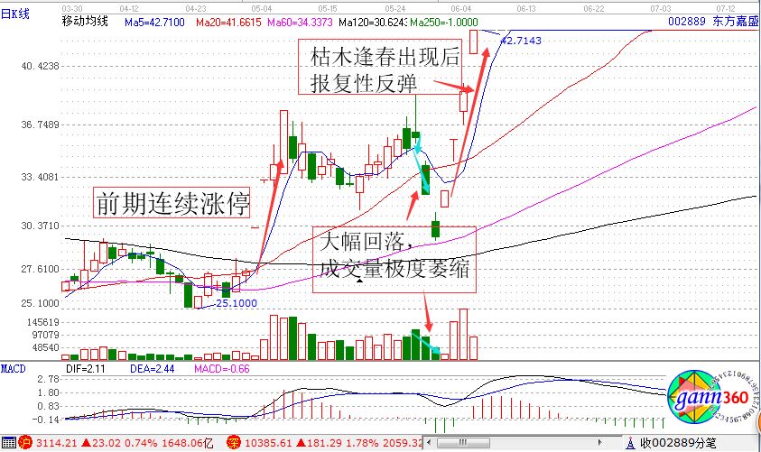 好在股價(jià)跌至60日線附近受到了支撐,同時(shí)成交量是極度的萎縮的,顯然完全符合了“枯木逢春”形態(tài)的特征,這就表明了該股空頭力量已經(jīng)得到了充分的釋放,后期價(jià)格迎來(lái)反彈那的可能性比較大。5月31號(hào)之后,大盤走勢(shì)也較給力,更進(jìn)一步刺激了東方嘉盛的反彈。我們可以看到東方嘉盛三天累計(jì)反彈幅度超28%!
