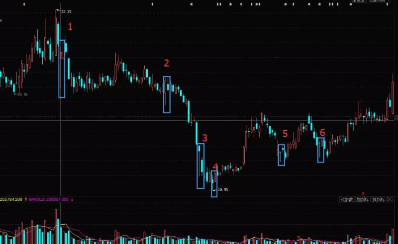 圖中用序號標示的是六處類似金針探底的K線,那每一處都是探底嗎?顯然并不是。下面就是逐一的介紹。
