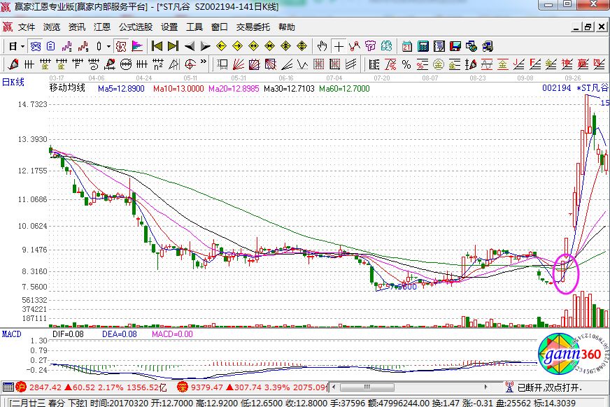 底部首板是怎么樣的?它其實(shí)指的就是股價(jià)處于股票的歷史走勢(shì)中的相對(duì)低位,首個(gè)交易日漲停就是底部首板。研究底部首板對(duì)于我們?cè)诮灰走^(guò)程中抓強(qiáng)勢(shì)股是非常重要的。例如*st凡谷在2017年9月份的走勢(shì)圖。