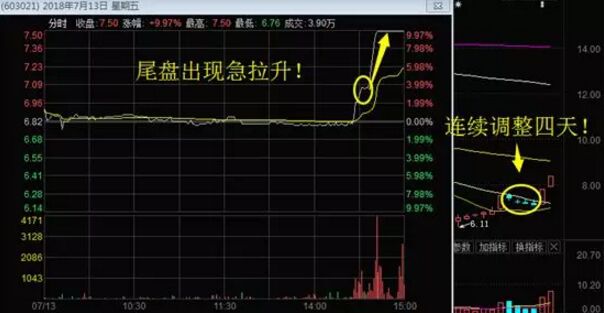 山東華鵬近期的日線走勢(shì)圖。左圖為山東華鵬在2018年7月13日的分時(shí)圖走勢(shì)??梢钥吹皆谖脖P14:30后,出現(xiàn)了一波急速的拉升,拉升幅度超6%!