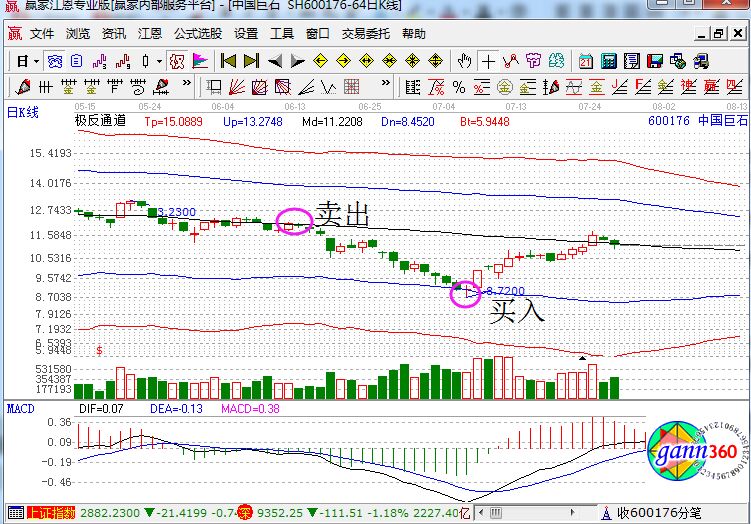 在波段操作中,買入時(shí)機(jī)也是非常重要的。因?yàn)楣墒遣环€(wěn),會反復(fù)的震蕩,就會形成一個(gè)區(qū)域,指數(shù)會在此區(qū)域內(nèi)上下波動,若指數(shù)上升過快,就會重新回到中心區(qū)域,若指數(shù)下跌過快,就會反彈到中樞。投資者可以根據(jù)此種現(xiàn)象來判斷最佳的進(jìn)場時(shí)機(jī)。這里有一個(gè)波段操作的好指標(biāo),它就是贏家江恩的極反通道指標(biāo),如下圖所示。