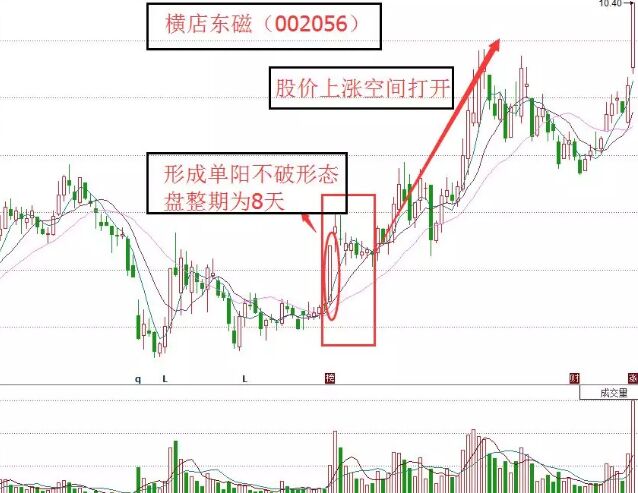 一根陽(yáng)線(xiàn)出現(xiàn)后,其后6到7根K線(xiàn)橫向盤(pán)整,并且所有低價(jià)都沒(méi)有擊穿該陽(yáng)線(xiàn)的最低價(jià),這就是典型的單陽(yáng)不破,如下面的圖形所示。