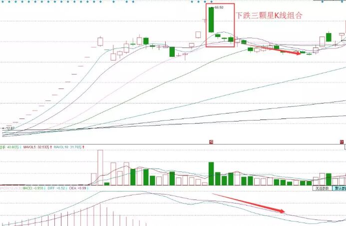 2、 如果在下跌末期出現(xiàn)下跌三顆星,則要通過(guò)多種角度來(lái)分析,如均線系統(tǒng)、指標(biāo)、量?jī)r(jià)關(guān)系來(lái)進(jìn)行綜合分析,是否會(huì)止跌反彈。