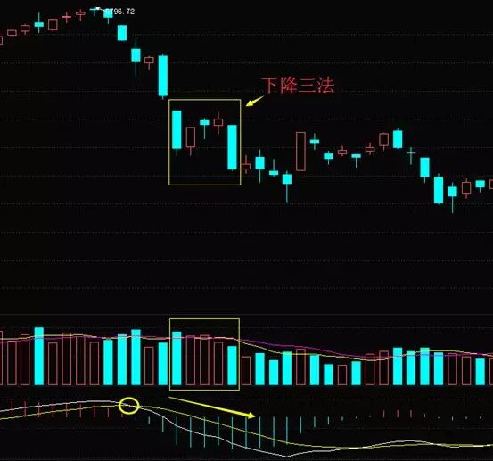 如上圖所示,當(dāng)形態(tài)走出后,可以發(fā)現(xiàn),這5根K線(xiàn)形態(tài)類(lèi)似矩形盤(pán)整,最后大陰線(xiàn)的創(chuàng)新低實(shí)際是跌破矩形盤(pán)整,因此K線(xiàn)后續(xù)仍是下降趨勢(shì)。當(dāng)該形態(tài)形成后,投資者最好觀察一下副圖指標(biāo)macd,如果macd剛形成死叉不就,或沒(méi)有明顯止跌回升跡象,則更可確認(rèn)后市將繼續(xù)下跌。