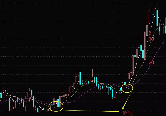 上圖是新坐標(biāo)的歷史走勢(shì)圖,從圖中我們可以看到:股價(jià)在低位盤整,均線來回纏繞波動(dòng),之后K線再度的回升,5日線上穿10日線形成金叉,5日線上穿20日線形成金叉,10日線上穿20日均線形成金叉,這樣就形成了三角形形態(tài),這種形態(tài)就是上面所說的價(jià)托。