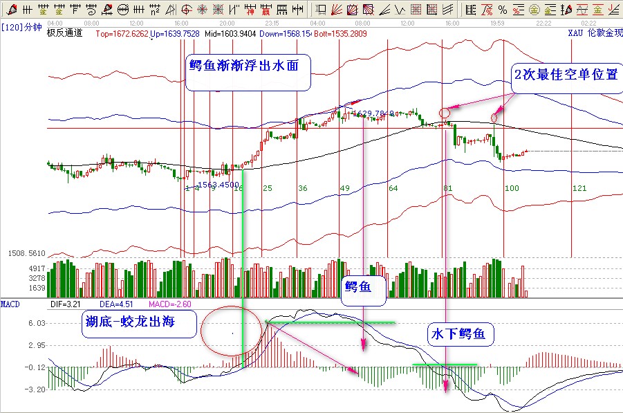在黃金價(jià)格在上新高的時(shí)候,平方時(shí)間的36【6*6】黃金價(jià)格2次觸摸極反通道上軌,但是macd指標(biāo)柱子沒有跟誰上升反其道而行