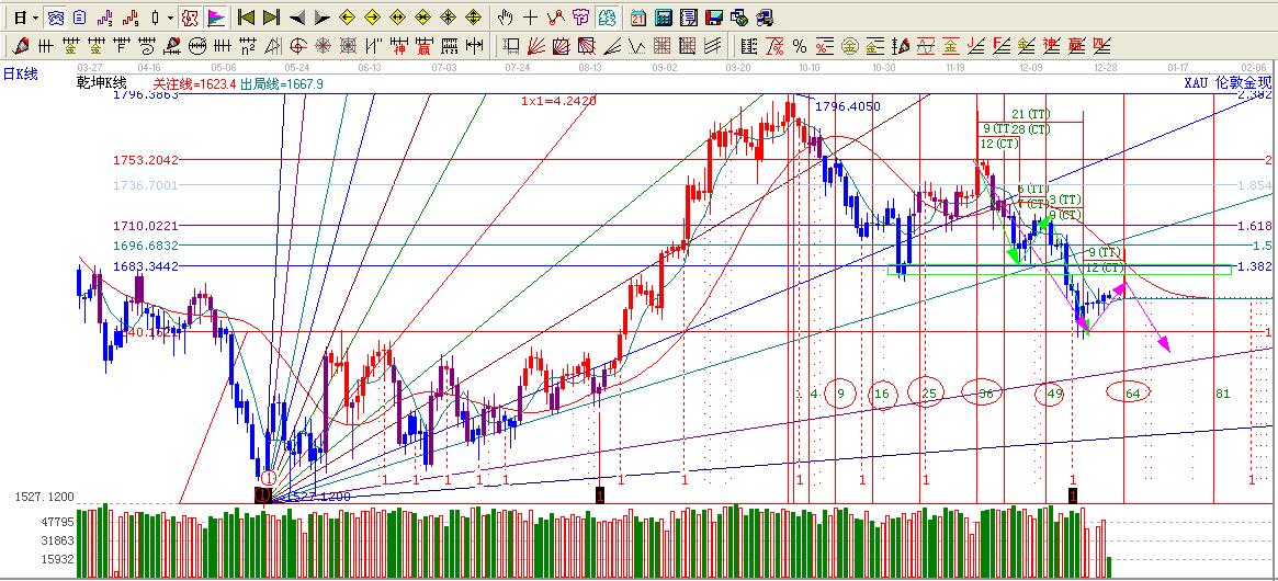 按照歷史我們?nèi)?fù)制一個969【實際是968】一個循環(huán)這一波反彈強壓力在黃金分割1.382位置1683.3及1672.5這里將構(gòu)成一個強的壓力區(qū)間,如果時間跟價格平衡,那么黃金在一次上演多空大戰(zhàn)。