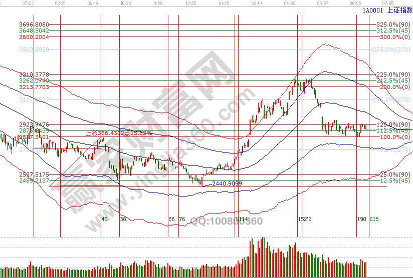 指數(shù)高開后一路震蕩走低,收盤正好落在近幾天談到的關(guān)鍵位2880附近,周一17號是日線時間窗口,關(guān)注好周末外部因素動態(tài),江恩價格四方形、60分鐘極反通道生命線(2880-2890)區(qū)間能守住則反彈延續(xù),失守則策略調(diào)整為區(qū)間交易法應(yīng)對,下方波段百分比延伸線1倍循環(huán)180度2834點依然是強支撐。最后說下,自5月以來對市場定性的為反彈,并且給出第一目標(biāo)位2950位置,第二目標(biāo)位是日線黑色生命線,保持平和的心態(tài)應(yīng)對市場。6月17號盤中支撐是0度2860點、315度2844點,盤中壓力是90度2894、135度2911點。操作策略,指數(shù)處于極反通道弱勢區(qū)域的反彈走勢,時間窗口關(guān)注好2880-2890區(qū)間得失,整體持倉保持3-5成。