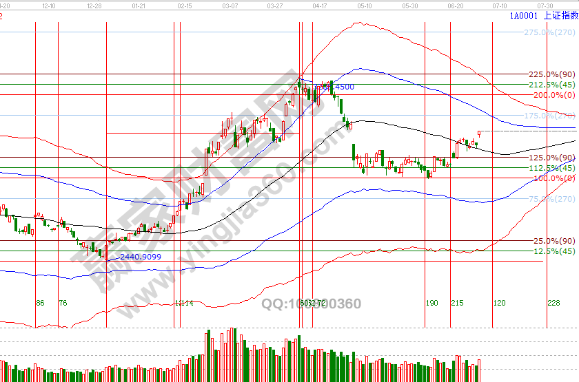 2840點(diǎn)一直是5、6月份贏家江恩大勢分析中強(qiáng)調(diào)的位置,同時(shí)江恩輪中輪時(shí)空分析一直未改變的觀點(diǎn)是60度2847點(diǎn)不破,按循環(huán)空間可以看到3051點(diǎn),指數(shù)已接近此點(diǎn)位,月線黑色生命線是3067點(diǎn),3051-3067所構(gòu)建的區(qū)間從工具判斷不在適合大舉開新倉,指數(shù)上攻超200點(diǎn),按買在支撐賣在壓力原則,指數(shù)未來越上攻應(yīng)以分批獲利兌現(xiàn)為主,3051-3067區(qū)間過后是日線藍(lán)色上軌線反壓。7月2號(hào)盤中壓力是135度3055點(diǎn)、180度3067點(diǎn),盤中支撐是90度3036點(diǎn)、45度3016點(diǎn),7月時(shí)間窗口是3(4)、15、23(24)號(hào);操作策略,指數(shù)極反通道生命線上安全區(qū)域震蕩,反彈動(dòng)作還在延續(xù),3051-3067區(qū)間附近高倉位可以分批兌現(xiàn)利潤,整體持倉保持3-5成。