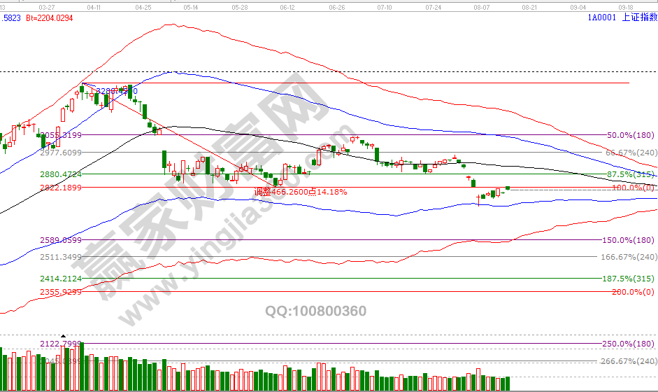 6號開盤前贏家江恩系統(tǒng)VIP學員區(qū)發(fā)周期共振圖,指數(shù)觸及極反通道藍色下軌線2744點后激進者開倉,并于當天收盤分析中給出反抽目標位是波段百分比延伸線180度2834附近,今日指數(shù)高開上攻正好到13號分析的反壓位2829點回落,學員區(qū)繼12號提示分批第一次減倉獲利后,今日早盤觸及15分鐘藍色上軌線再度做圖分析達到獲利了結條件。隨著時間窗口、目標價臨近,代表價格將再會進入一次較大波動期,另外早盤談到科技股短期高點形成,激進者剩余最后一批倉可以以百分比延伸線120度2791為參考線。8月15號盤中壓力是225度2815點、270度2829點,盤中支撐是135度2786點、90度2772點,本周五日線時間窗口。操作策略,指數(shù)生命線下弱勢區(qū)運行,激進者3成倉交易,穩(wěn)健者空倉休息。
