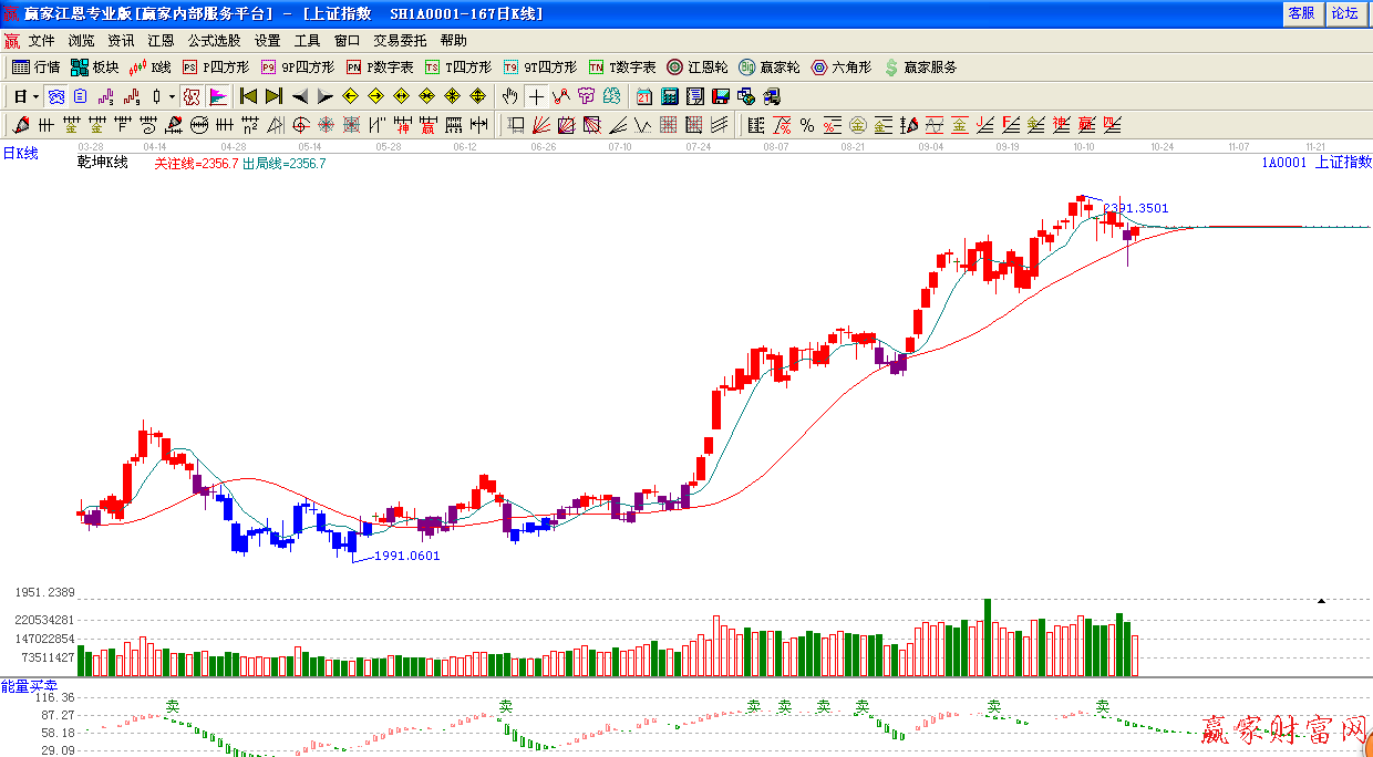 ★依據(jù)贏家江恩系統(tǒng)乾坤K線提示:回踩紅色關(guān)注線,再次出現(xiàn)紅色k線,短線看空,波段看多。