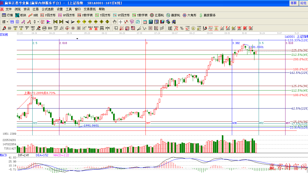 江恩看盤(pán)綜述:依據(jù)贏家江恩技術(shù)工具分析得出:今日上證指數(shù)回探江恩45度2340點(diǎn)后,震蕩反彈,以小陽(yáng)線報(bào) 收,市場(chǎng)整體進(jìn)入維穩(wěn)期,由于今日反彈量能萎縮明顯,短期不排除震蕩反復(fù)走勢(shì),下以時(shí)間窗口在22日。預(yù)計(jì)將會(huì)明確方向。操作上,適當(dāng)控制倉(cāng)位,投資者可適當(dāng)挖掘低價(jià)藍(lán)籌股的補(bǔ)漲機(jī)會(huì)。