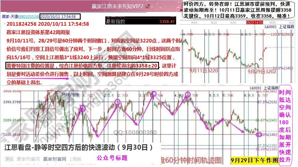 江恩理論,作為金融市場(chǎng)的高端技術(shù)體系,其尤為注重對(duì)市場(chǎng)時(shí)間和價(jià)格的研究分析,借助專業(yè)的數(shù)學(xué)模型有效的找到歷史走勢(shì)中所蘊(yùn)含的時(shí)價(jià)因子,從而提前推演未來(lái),找到市場(chǎng)的時(shí)價(jià)四方拐點(diǎn),精準(zhǔn)把握趨勢(shì)及波動(dòng)利潤(rùn)?;仡櫣?jié)前預(yù)測(cè)分析,9月29日時(shí)間窗口到達(dá),空間上再探3220±20一線,時(shí)空相遇形成四方,轉(zhuǎn)勢(shì)迫在眉睫。公眾號(hào)yingjiajiangen江恩看盤標(biāo)題直接強(qiáng)調(diào)“靜等時(shí)空四方后的快速波動(dòng)”,注意關(guān)鍵詞“快速波動(dòng)”。實(shí)則,對(duì)照60分鐘的時(shí)價(jià)分析圖,時(shí)間抵達(dá)空間確認(rèn)180度關(guān)鍵位形成四方點(diǎn);11日高開高走,12日繼續(xù)高開高走,強(qiáng)勢(shì)收在3358點(diǎn)。此點(diǎn)位在11日周報(bào)預(yù)期中特別強(qiáng)調(diào),完美抵達(dá),29日前后低吸的倉(cāng)位收獲滿滿。(預(yù)判市場(chǎng)快速波動(dòng)的條件是什么?上周六VIP內(nèi)部培訓(xùn)課有詳細(xì)講解)