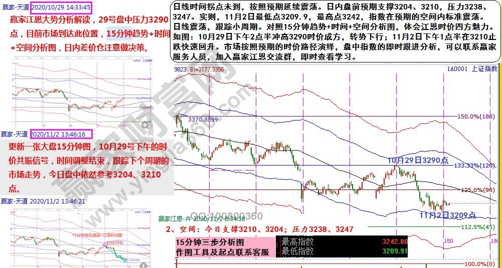 在本周周報預測分析中,已經給出11月重要時間節(jié)點。強調日線時間拐點未到,按照預期將延續(xù)震蕩。11月2日盤前預期的日內支撐3204、3210,壓力3238、3247。實則,11月2日最低點3209.9,最高點3242,指數在預期的空間內標準震蕩。江恩對于支撐阻力研判的精準性,在提前預測與實際點位的對比中鑒證。