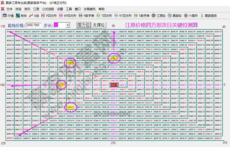 26號日內(nèi)空間關鍵位測算:江恩價格四方形預判支撐3558、3568,壓力3596、3608。