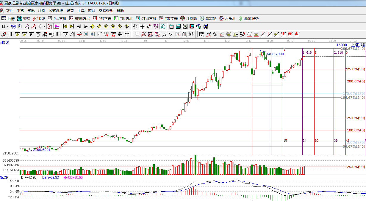 ★依據(jù)贏家江恩理論系統(tǒng)波段百分比提示:短期上方阻力位是江恩百分比240度,3436點(diǎn),270度,3486點(diǎn),支撐90度3188點(diǎn)。