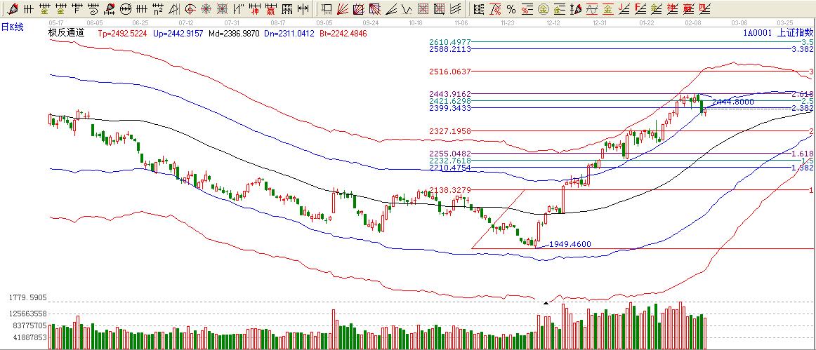 綜上所述:大盤(pán)失手極反通道藍(lán)色上軌位置2404短期壓力這里不過(guò)看跌一線(xiàn)至2330附近。