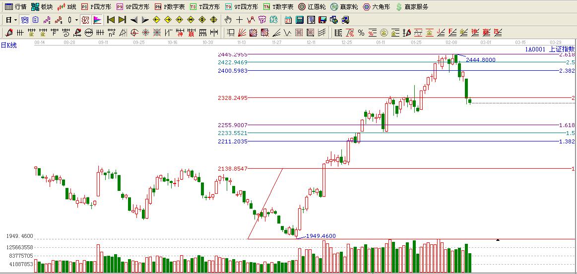 ☆依據(jù)贏家黃金價(jià)格延伸線提示:大盤如期跌至黃金分割延伸線2倍位置,短期構(gòu)成壓力,這里不過看低一線至1.618位置2255附近.