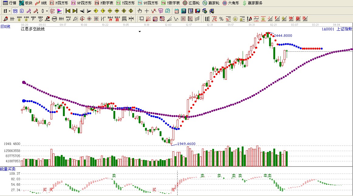 ★依據(jù)贏家江恩多空戰(zhàn)線提示:目前大盤運行在長期紫色多空線上方,短期藍色線上方,謹慎做多。