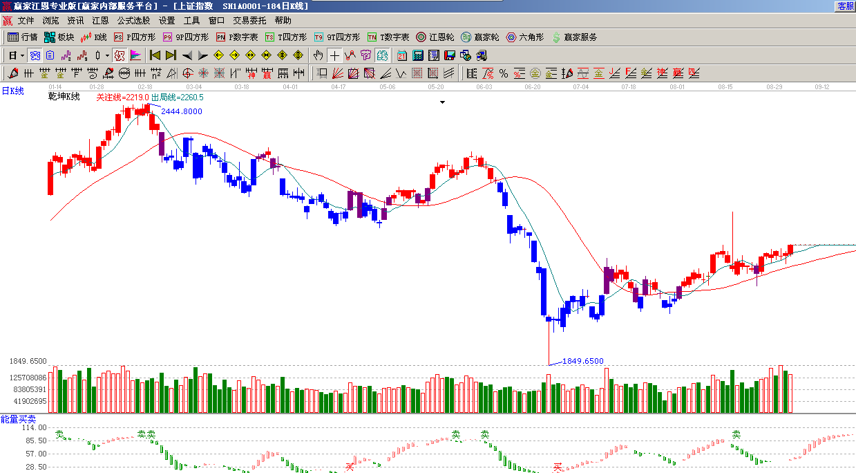 ★依據(jù)贏家江恩系統(tǒng)能量買賣提示:多頭當(dāng)前占據(jù)優(yōu)勢,主現(xiàn)紅色柱子;(1)