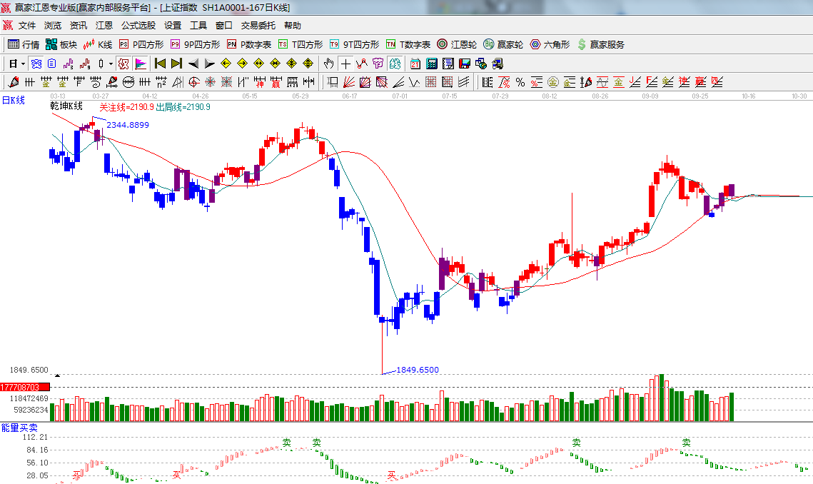 ☆依據(jù)贏家江恩系統(tǒng)能量買(mǎi)賣(mài)提示:多空轉(zhuǎn)換區(qū),等待紅色柱;