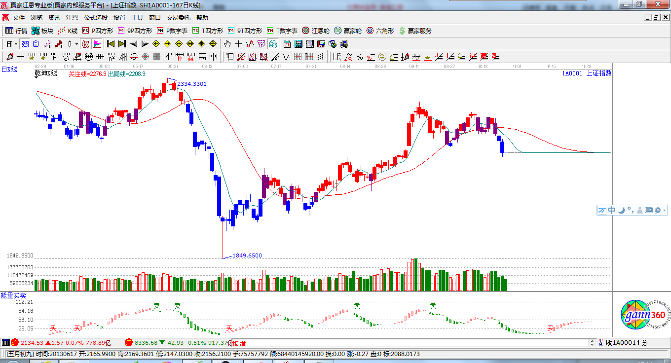☆依據(jù)贏家江恩系統(tǒng)乾坤K線提示: 藍色休息區(qū)以保守或空倉為主;