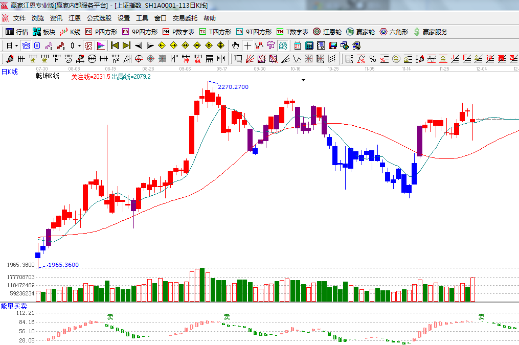 ★依據贏家江恩系統(tǒng)乾坤K線提示: 關注線、出局線多頭排列,收盤藍色短期出局線上,繼續(xù)看多;