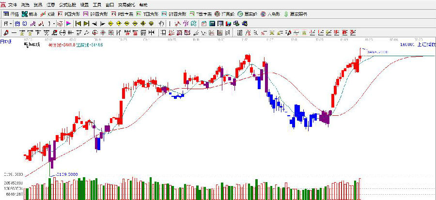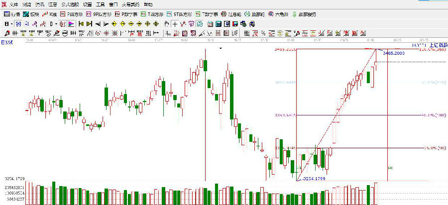 ★依據(jù)贏家江恩理論系統(tǒng)江恩波段百分比提示:滬指在創(chuàng)新高,阻力位依舊是3456點(diǎn)附近,支撐是百分比270度線3412點(diǎn)附近。